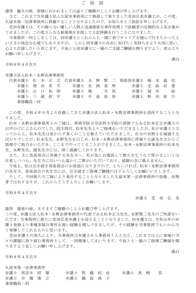 当法人久留米事務所にて執務して参りました花田弘美弁護士が、この度、久留米第一法律事務所に移籍することとなりました。